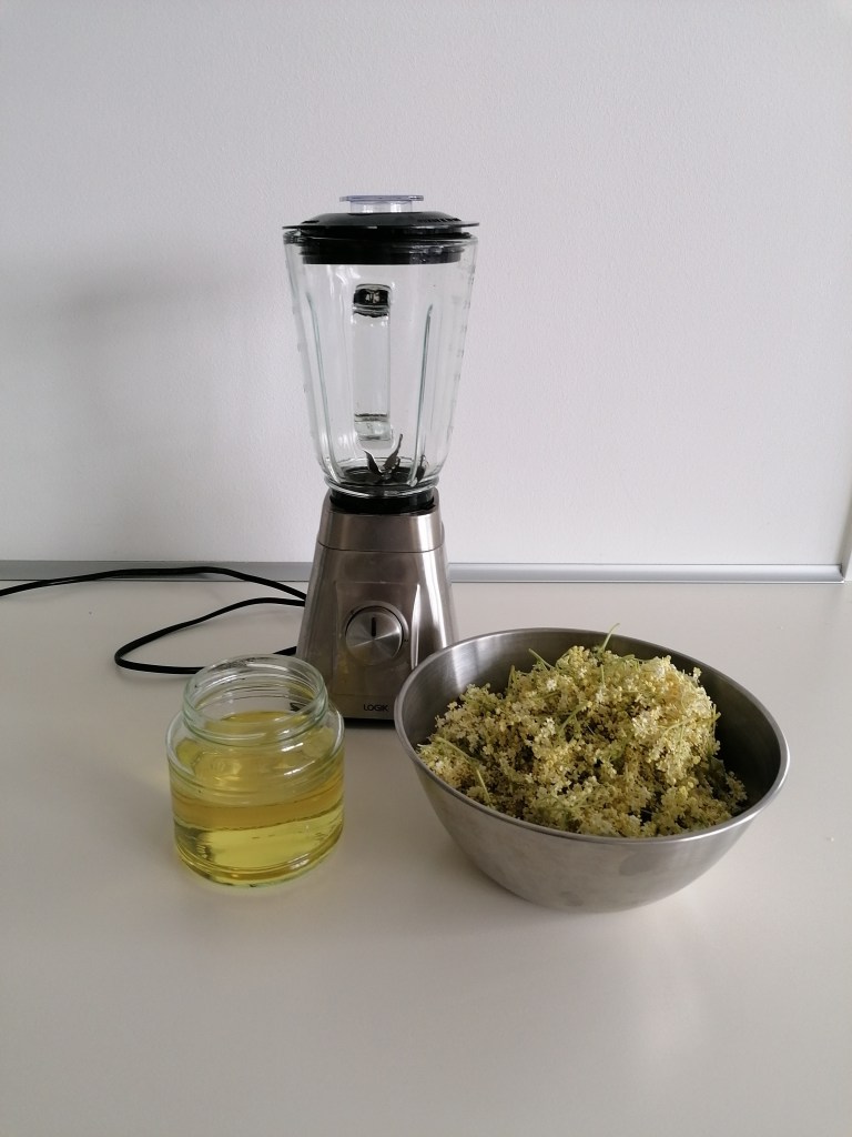 Na początku poskub kwiatki z zielonych łodyg są trujące. Jeszcze za nim je zaczniesz skubać dobrze jest rozłożyć kwiatki na balkonie albo na zewnątrz na blasze tak aby wszystkie małe żyjątka mogły uciec do domu. Zaoszczędzicie sobie spotkania ich podczas przebierania kwiatów na olej. Następnie rozgrzej olej do 60 C / 65 C. Uważaj przy okazji, można się poparzyć. Gotowy olej wrzucamy do blendera ½ partii kwiatów, miksujemy na pełnych obrotach. Dodajemy kolejne kwiaty, miksujemy aż uzyskamy pulpę, masę o jednolitym brązowym kolorze. Taką mieszankę, przelej do pojemnika i zostaw na noc w lodówce. Na drugi dzień, przelej przez gazę. Przecedzony olej przelej do butelek. Nie przejmuj się kolorem, będzie mętny, ale po paru dniach w lodówce zrobi się klarowny.