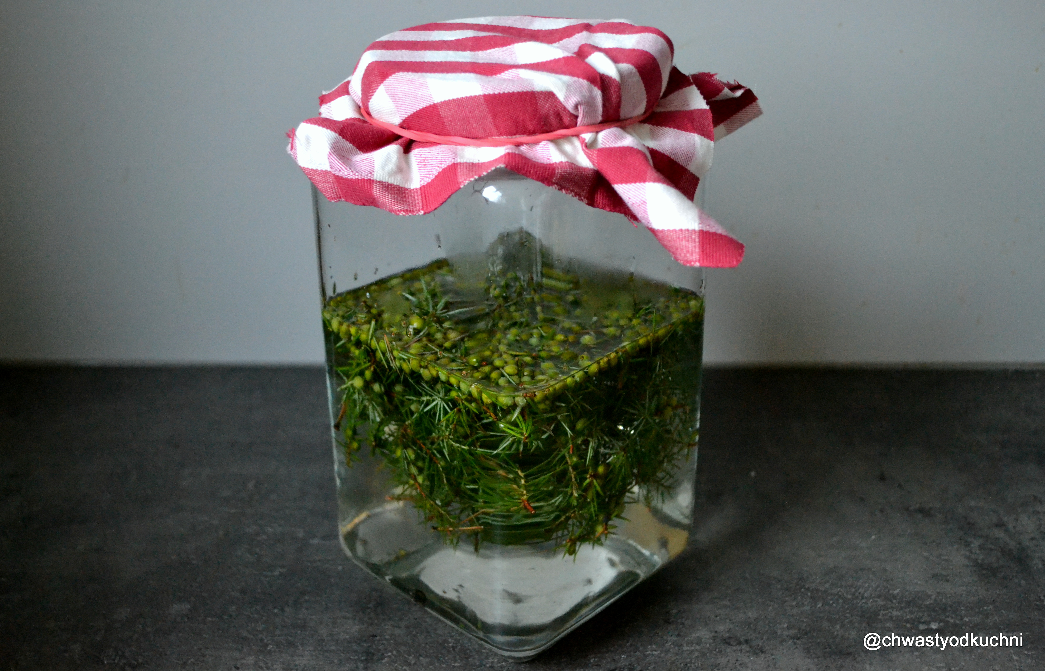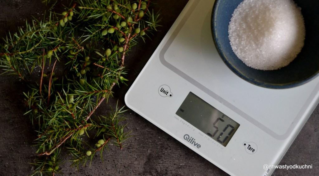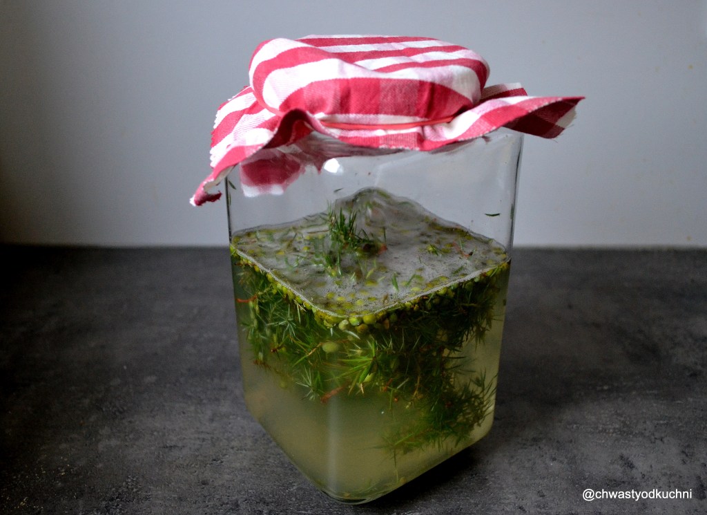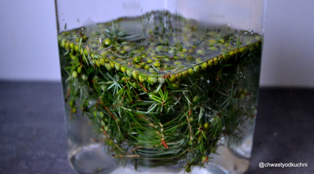 W obawie że zabiję swoje dzikie drożdże, fermentuje je bez wcześniejszego gotowania. Mam zielone świeże jagody jałowca. Część ugnieciona z miodem, druga połowa w całości. Wrzuciłem również parę gałązek dla wzmocnienia aromatu.