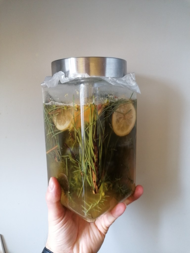 Na początek igliwie pokrój na małe kawałki, potrzebujesz tylko igły bez gałązki. Następnie w moździerzu ugnieć je wraz z łyżką brązowego cukru. Puszczą wtedy soki i będzie mocniejszy aromat. Owoce jałowca rozgnieć nożem, tak aby tylko naruszyć ich strukturę, podzielą się smakiem podczas fermentacji. Odbierz małą część wody z przepisu, zagotuj. Rozpuść cukier i syrop w letniej wodzie. Igliwie z cukrem oraz jałowiec przełóż do słoika, dolej wodę oraz rozpuszczony cukier z syropem. Połowę cytryny pokrój w plasterki i dodaj co całości. Zakręć szczelnie słoik i fermentuj w ciemnym miejscu przez 4 dni, aż pojawi się pierwsza piana i bąbelki gazu. Przez te dni mieszaj słoikiem, tak aby drożdże cały czas pracowały. Gdy zobaczysz że napój zaczyna gazować, czas go przelać przez gazę. Gotowy napój przelej do butelek (najlepsze są po piwie – Grolsh z mocnym gwintem). Przelane odstaw na kolejne 4 do 5 dni w ciepłym miejscu, aby mocniej zagazować. Kontroluj ciśnienie, po trzech dniach otwórz jedną butelkę, aby sprawdzić poziom nagazowania. To bardzo ważne, czasem zbyt duże ciśnienie może spowodować eksplozję ! Gdy oranżada jest gotowa, schowaj do lodówki, zatrzymasz fermentację. Taki napój możesz przetrzymać przez siedem dni.