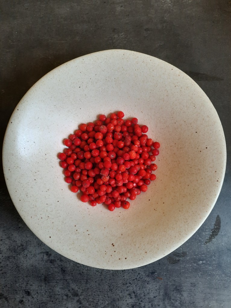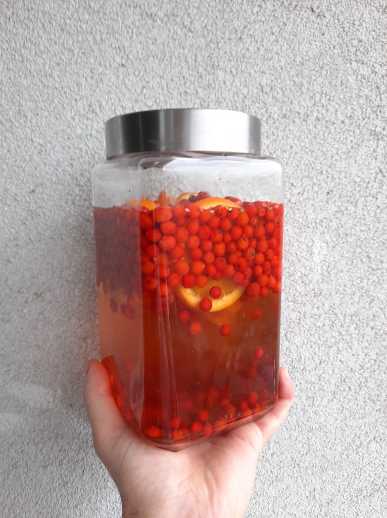 Trafiło mi się bo dostałem cały worek koło kilograma, pełen jarzębiny, zmrożonej, idealnej. Spędziła dobre dwa miesiące w zamrażalce więc o kwasie parasorbowym zostały tylko złe wspomnienia (to ten kwas który szkodzi nam gdy zjemy ją prosto z drzewa, przed przymrozkami). Miałem na początku lekkie wątpliwości czy się uda, zawsze przy fermentacji kwaśnych produktów, proces trwa dłużej, czasem trzeba dodać więcej cukru. W tym przepisie zastosowałem standardową bazę czyli 1 litr = 100 g cukru.