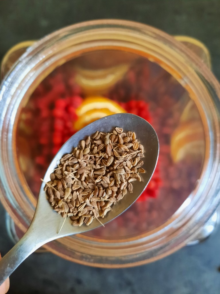 Potrzebujesz słoik dwu litrowy, kawałek gazy i gumkę recepturkę. Wodę zagotuj, schłódź. Owoce jarzębu wrzuć do słoika, tak samo kwiaty oraz nasiona anyżu. Pomarańcz oczyść dokładnie, do oranżady pójdzie cała ze skórką. W odrobinie wody, rozpuść cukier, następnie wymieszaj z pozostałą wodą. Wlej wodę z cukrem do słoika i zamknij szczelnie. Fermentuj do pierwszych oznak fermentacji, czyli jak zacznie gazować. Odlej i przecedź po drugim dniu gazowania. Przelej do mocnych butelek z gwintem, do środka wrzuć po dwie rodzynki, jeśli wzniosą się do góry to znak że jest wystarczająca ilość gazu w butelce. Taki napój w butelkach przetrzymaj jeszcze przez 3 do 4 dni, po tym czasie schowaj do lodówki. Jeśli boisz się szkła, możesz przelać do butelek plastikowych, ale to moja sugestia, sam wiesz jaki jest stosunek teraz do plastiku.